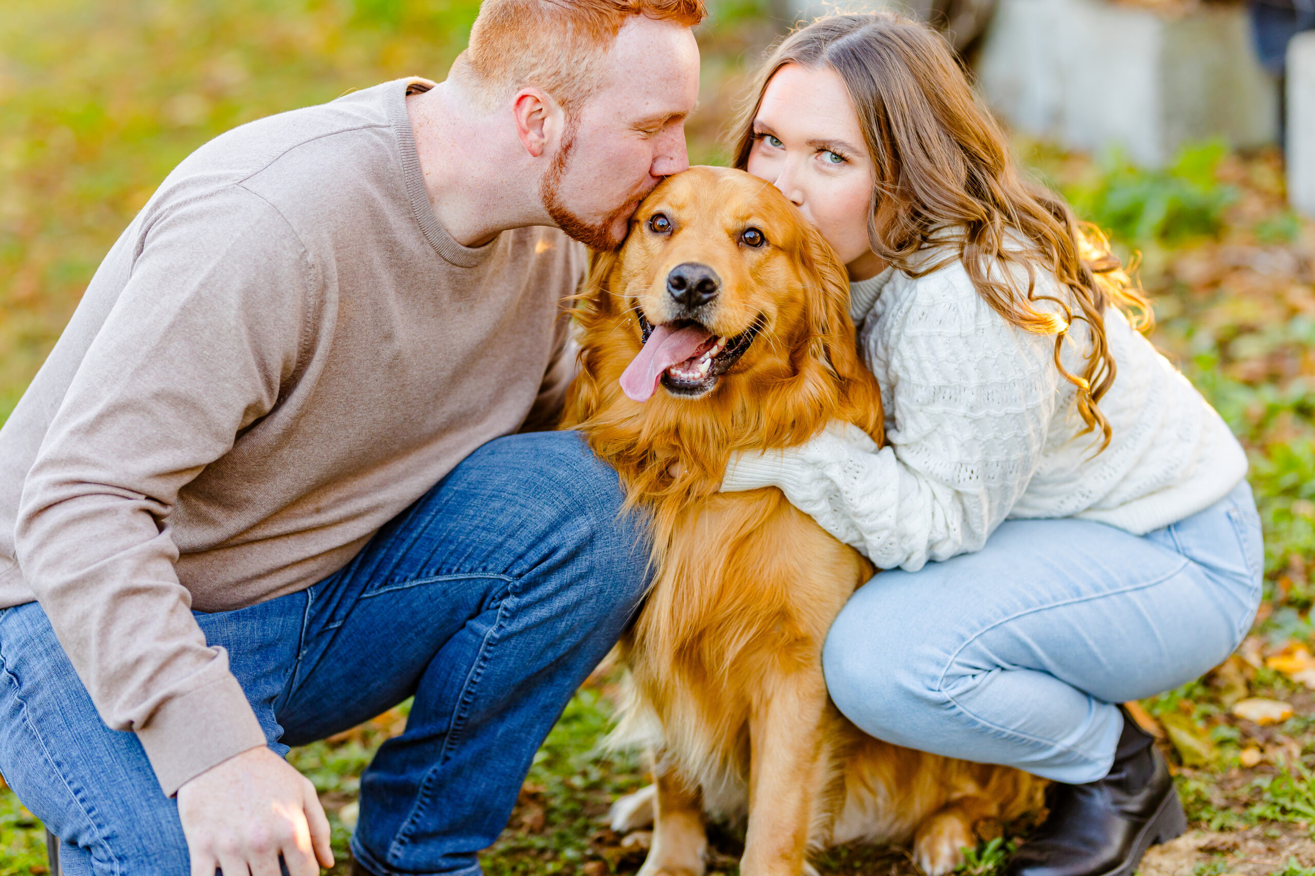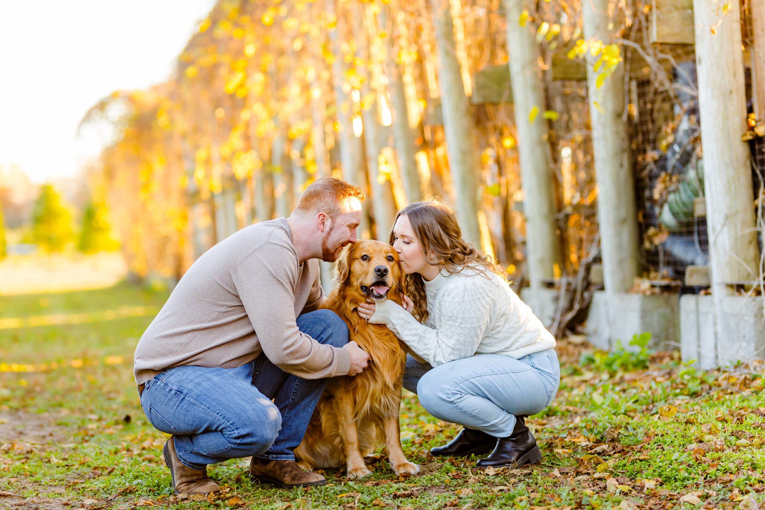 And of course, their golden retriever Copper joined us for part of the session. He is their baby, and having him run through the trees and cuddle up between them made everything feel even more “them.”
